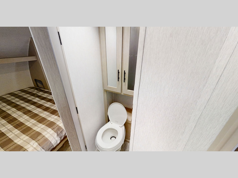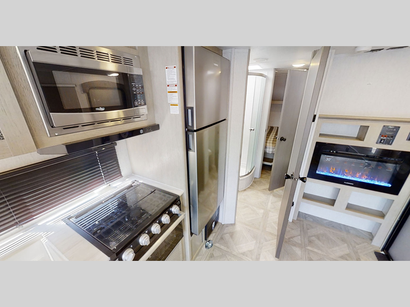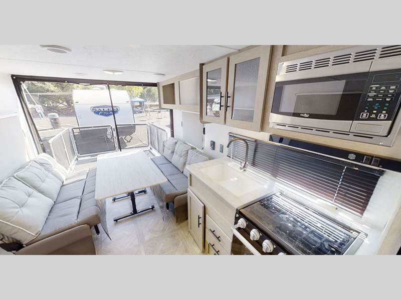 There are stylish window shades inside, along with TFL cabinet doors, upgraded backsplash, plus elegant curtain rods and curtains to make you feel more at home. You will also appreciate some of the best-in-class features such as, an enclosed Accessibelly for added protection, exterior accent lighting, a powder coated I-beam frame, and seamless holding tanks.